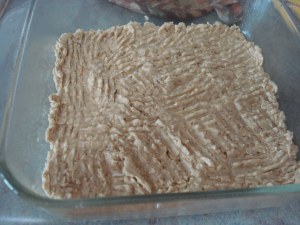 Spray a 8×8 pan with olive oil, cooking spray, whatever you have on hand. Spread half of the dough into the pan.