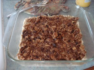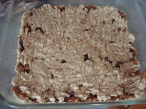 Spread the remaining dough on top of the mixture and bake at 375 degrees for 30 minutes.
