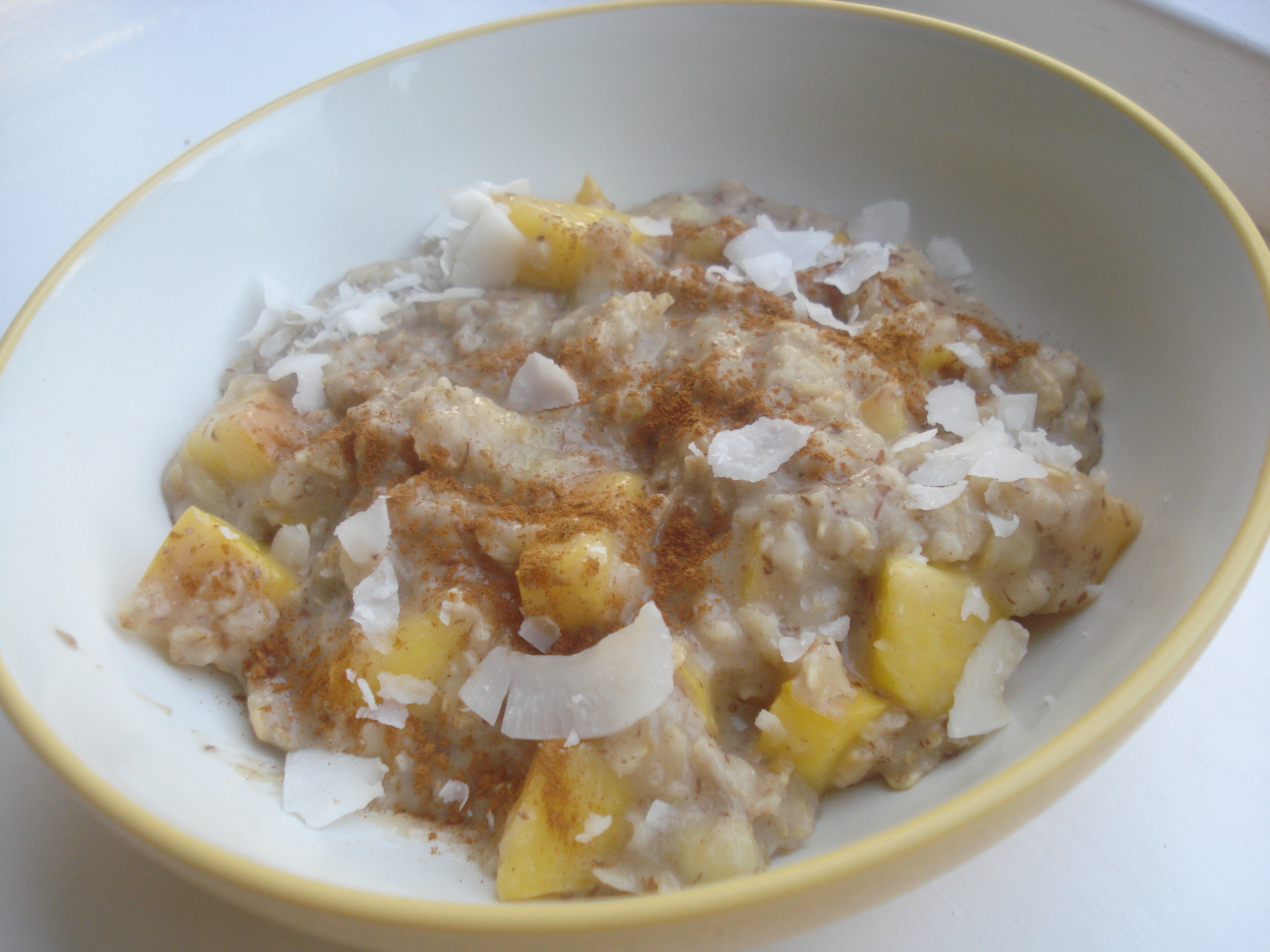 - Coat your peaches with cinnamon in a cup - once oatmeal is almost to desired consistency, add peaches to the mix and heat through.