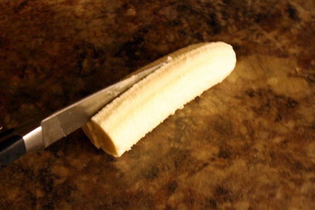 You only need half of a banana — unless you like a whole (who am I to tell you how to eat your bananas?). Slice the banana in half length-wise.