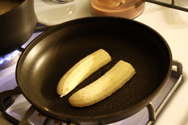 Spray a small skillet with cooking spray and heat to medium. Do not heat your skillet too high as no one likes scorched bananas. Sprinkle cinnamon on the inside slices of the bananas and lay facedown in the skillet. Heat for two-three minutes and flip. Before you flip though, be sure to sprinkle cinnamon on the other side as well. Heat for an additional 2-3 minutes.