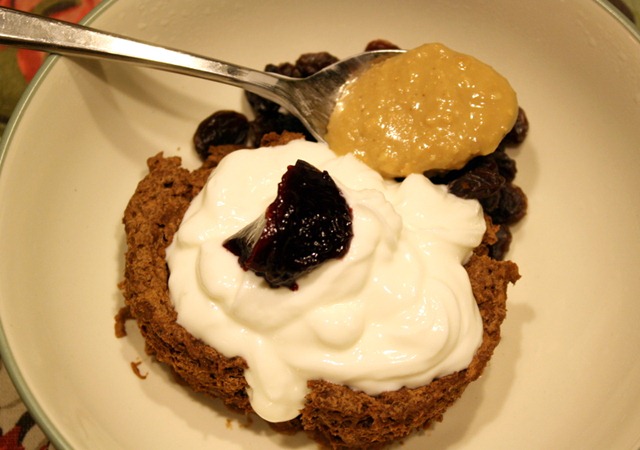 1 scoop Sunwarrior, 1 flax egg, a pinch of baking soda, cinnamon, some vanilla, and about 2 tbsp unsweetened applesauce. All in the microwave for about 3 minutes!