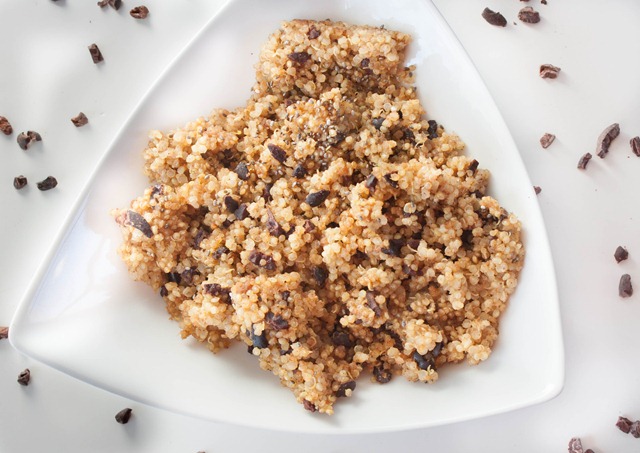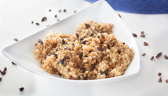 Directions: In a medium sized saucepan, bring 1 cup quinoa, 1 cup water, and 1 cup coconut milk to a rapid boil. Once the liquid is boiling, add vanilla, cinnamon, and agave. Reduce the heat to low and cover. Cook for approximately 15-20 minutes, or until the majority of the liquid has been absorbed. When the quinoa has some liquid left, add the peanut flour and stir well until all ingredients are mixed. (If you waited too long to add the peanut flour and the quinoa seems too dry, just add a little more liquid!) When quinoa is fully cooked, add the cacao nibs and stir.
